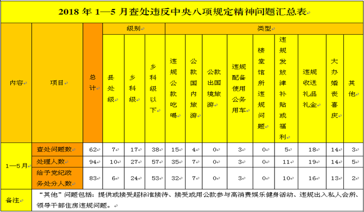 2018年1—5月,全市共查处违反中央八项规定精神问题62起,处理94人,给予党纪政务处分83人,分别比去年同期上升21.6%、40.3%、45.6%,体现了越往后执纪越严的要求。市纪委分3批对10起14人违反中央八项…